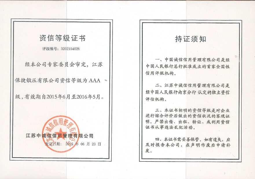 江蘇保捷鍛壓有限公司資信等級為AAA級